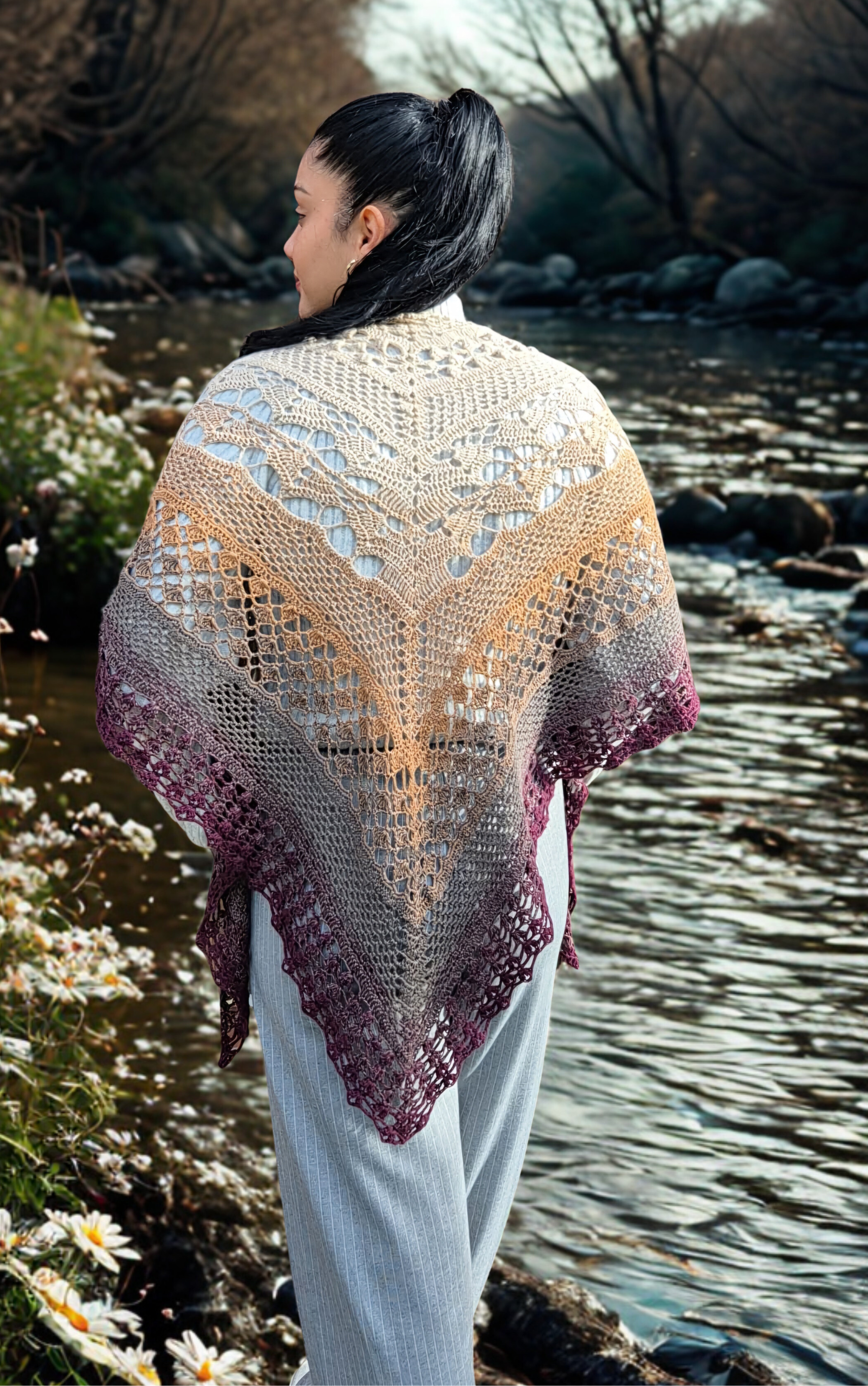 Eingehüllt in die goldene Umarmung der Herbstblätter, entfaltet dieses edle Häkeltuch, genannt "Fluss der Seelen," seinen gesamten Charme und seine unvergleichliche Schönheit. Die Blätter tanzen sanft im Wind, als ob sie von der Anmut des Tuches selbst inspiriert wären. Jede Masche, jeder Stich erzählt eine Geschichte von Eleganz und handwerklicher Kunstfertigkeit.